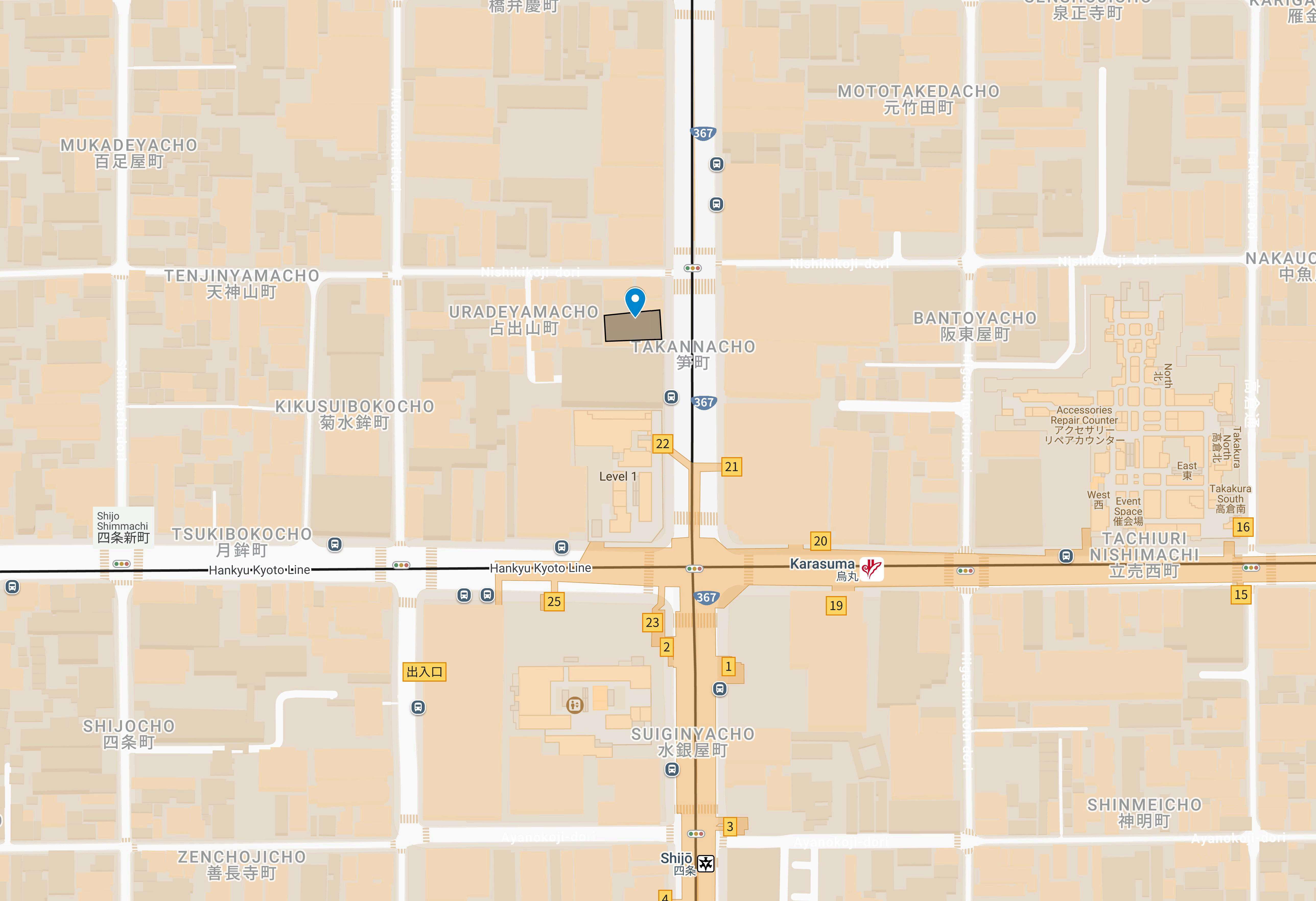 Hankyu Kyoto Line “Shijo Karasuma”Station.Please exit out of exit 22 at that station.